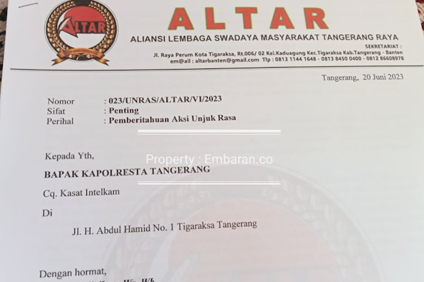 Embaran.co – Tidak terima dituding sebagai pemicu pemutusan hubungan kerja (PHK) dan hengkangnya sejumlah perusahaan di Kabupaten Tangerang Banten, Aliansi Lembaga Swadaya Masyarakat (ALTAR) melayangkan surat pemberitahuan aksi unjuk rasa (UNRAS) ke Polresta Tangerang dengan nomor: 023/UNRAS/ALTAR/VI/2023, perihal aksi unjuk rasa.