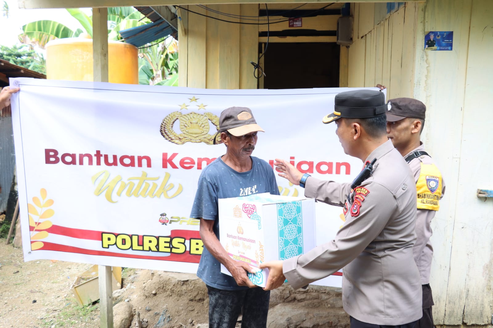 Dalam kegiatan tersebut Kapolres Baubau AKBP Bungin Masokan Misalayuk, SH, SIK, Msi yang di wakili Waka Polres Baubau Kompol Ronald Abdul Gani Sirait, SE, SIK, bersama PJU Polres Baubau menyerahkan bantuan sosial kemanusiaan untuk negeri sebanyak 100 ( seratus ) paket Sembako berupa beras, minyak goreng, indomi dan gula.
