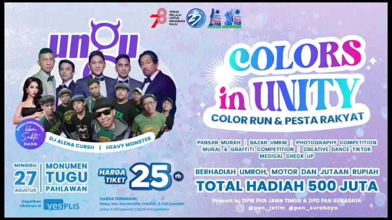 Akan tampil artis nasional di ‘Color in Unity’ menghibur warga Kota Surabaya dan sekitarnya. Diantaranya Band Ungu, Heavy Monster, DJ Alena Cursh dan hiburan lainnya.